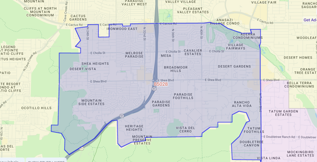 The Sheaborhood is located in North Phoenix’s 85028 zip code, generally centered around 32nd Street and Shea Boulevard, just east of State Route 51. From here, you’re typically about 15–20 minutes from downtown Phoenix or Sky Harbor Airport in normal traffic, with Scottsdale employment and shopping areas also close by.
